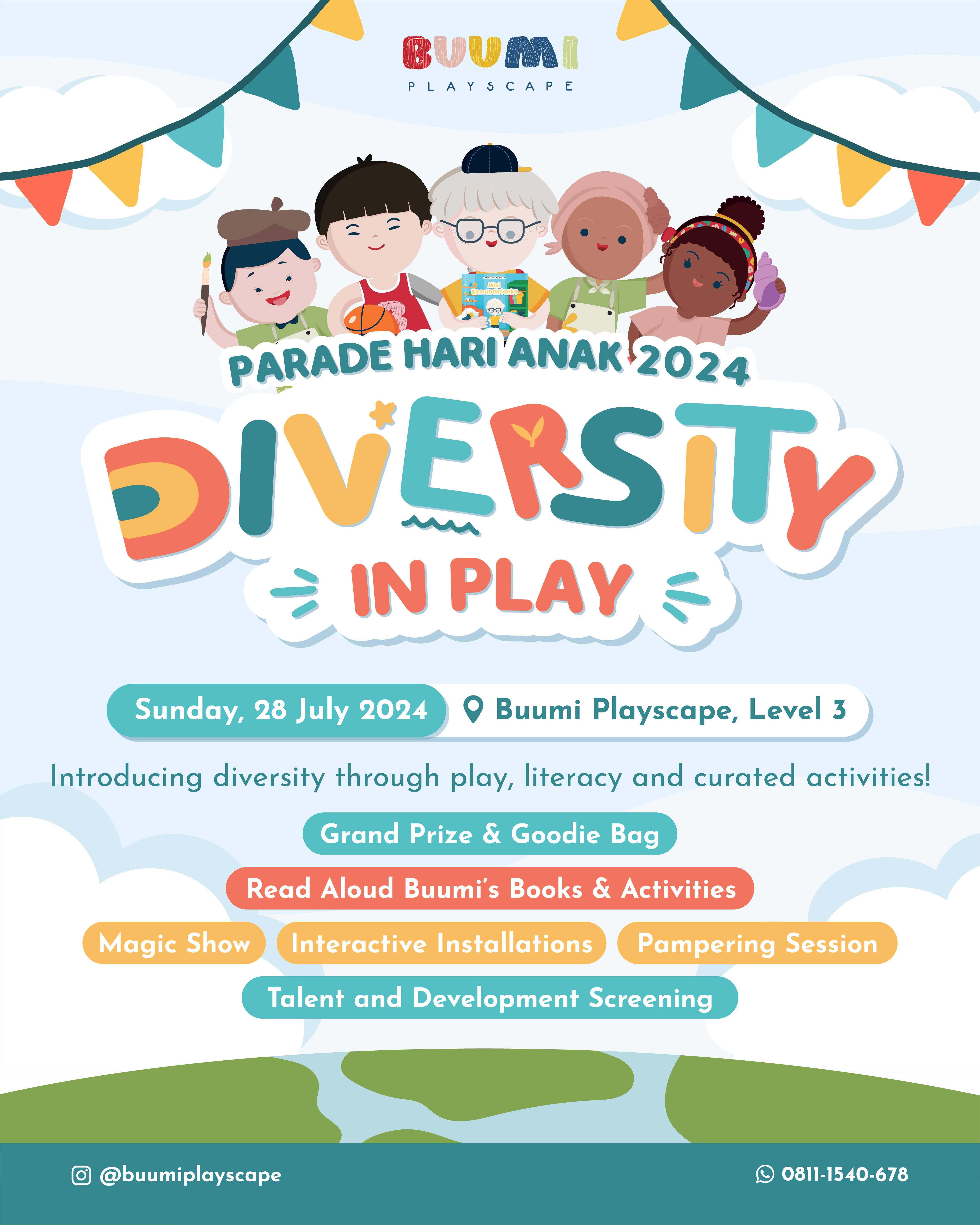 july, 2024 BUUMI PLAYSCAPE Plaza Senayan, Level 3 28jul10:00 am10:00 pmBUUMI PLAYSCAPESAVE FOR THE WEEKEND! ? Buumi Playscape proudly present Parade Hari Anak 2024 : Diversity in Play Sunday, 28 July 2024 | 10 AM - 7 PM ?Buumi Playscape, Plaza Senayan Jakarta Level 3 Ticket Price: 250K (1 anak & 1 pendamping) for 2 hours Ticket available On The Spot and online at Traveloka Come enjoy and get exclusive goodie bag and grand prize worth of millions! ?? #ParadeHariAnak2024 #DiversityinPlay #maindibuumi #BuumiPlayscape #HariAnakNasional #playgroundjakarta #rekomendasiplaydate #acaraharianak — Hari Anak, Parade Hari Anak 2024, Diversity in Play, Buumi Playscape, playground jakarta, rekomendasi playdate Time (Sunday) 10:00 am - 10:00 pm LocationPlaza Senayan, Level 3 CalendarGoogleCal Leave a Reply Cancel Reply Name * Email * Website Save my name, email, and website in this browser for the next time I comment.