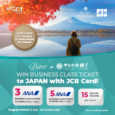 14jul(jul 14)10:00 am20oct(oct 20)10:00 pmJCB YOKOCHO FACE 2Congratulations to the lucky winners of the JCB Indonesia Lucky Draw! Thank you for shopping at Yashinoki Yokocho, Plaza Senayan. Winners will be contacted directly by JCB Indonesia — no fees required. Didn’t win this time? Phase 2 is now open! Swipe your JCB Card at Yashinoki Yokocho to increase your chances.
