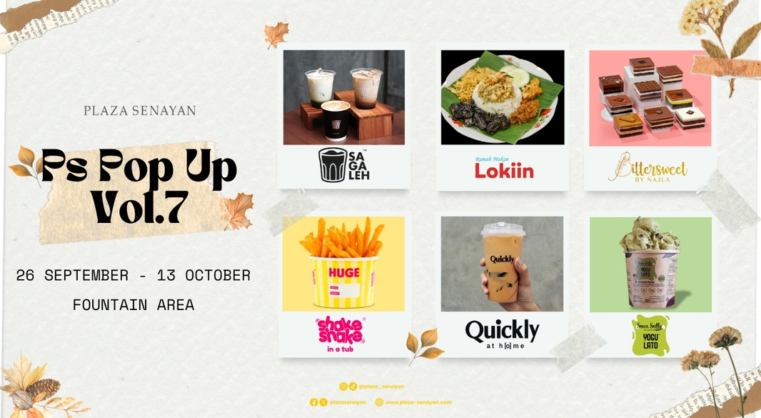 26sep(sep 26)10:00 am13oct(oct 13)10:00 pmPlaza Senayan - Pop Up Vol.7Visit the Plaza Senayan Pop Up Vol.7 at Fountain Area.